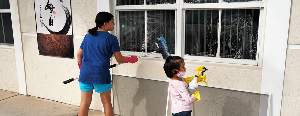 為培養小朋友「三好」精神,Sophie師姐帶著5歲女兒ㄧ起參與;Vivian師姐讀小學的兒子跟在媽媽身旁幫忙;林秀珍師姐讀初中的女兒也一起加入媽媽清洗紗窗的行列;年逾85歲的郭蘭英師姐也滿心歡喜的在五觀堂擦拭灰塵,大家互相幫忙,整個道場就像一個佛光大家庭。出坡作務也是生活的修行,大家由此培養福德,以便耕耘心田。