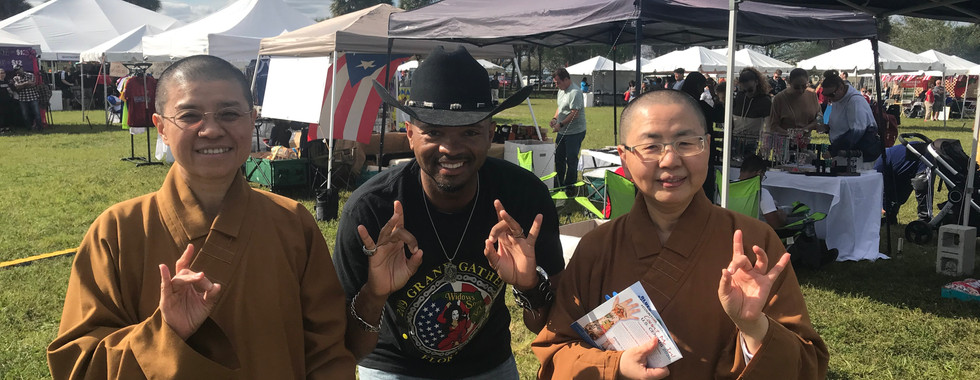 住持永瀚法師、覺嚴法師和妙餘法師在會長梅寒錚的帶領下前往探視,當地民眾喜見法師到來,除恭敬合掌問候外也紛紛要求與法師合影。之後,各個歡喜地以剛學會的蓮花手印,四處遊走會場,把佛教的清淨無染、歡迎與接納的慈悲精神與眾結緣。