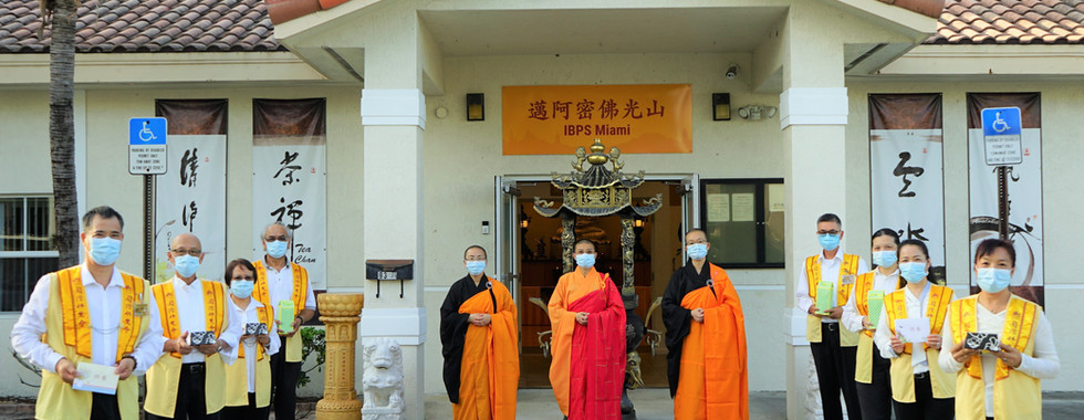 雖然受疫情影響不能群聚,佛光會員按照政府規定保持社交距離,戴上口罩,穿著整齊的服裝,分三組虔誠地向三位法師獻上供養。接著由住持永瀚法師帶領幹部在佛前恭誦《心經》及星雲大師〈為在家信眾祈願文〉,整個儀式簡單而隆重,邁阿密佛光人法喜充滿在「孝道月」中不忘初心,弘揚與傳承佛陀的教義。
