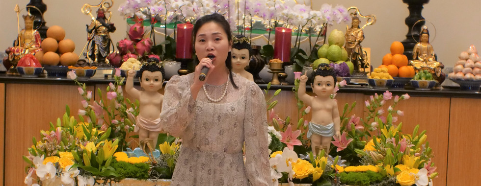 住持永瀚法師帶領眾人以英文唱誦「三寶頌」,並引領貴賓以花瓣撒在浴佛池內,象徵太子的誕生,腳踏蓮花。隨後領眾誦讀《心經》,恭讀佛光山星雲大師〈佛誕節祈願文〉,眾人在〈浴佛偈〉莊嚴梵唄音聲中,依序虔誠浴佛,恭敬地為悉達多太子澆灌沐浴湯,共同沉浸在祥和的氛圍中。