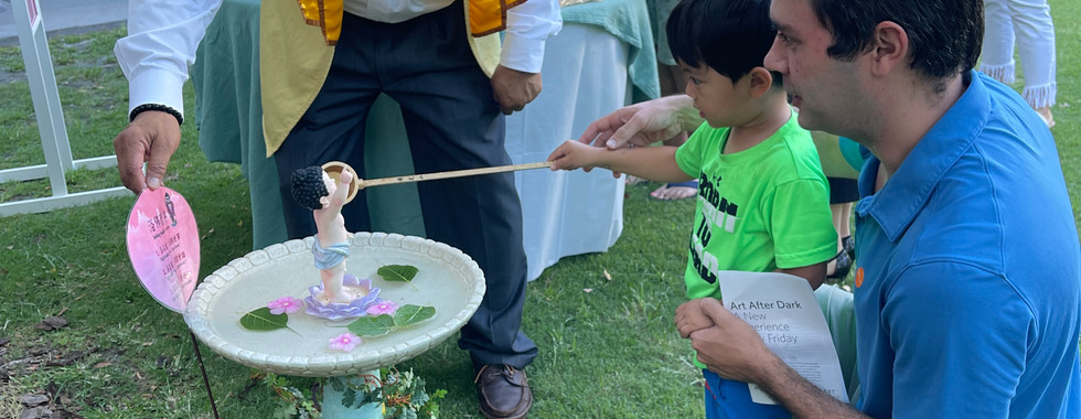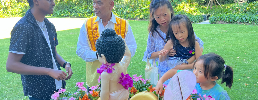 Fo Guang Shan Miami set up a Buddha Bathing Pool in the museum's modern sculpture garden. Known as the "Museum in a Garden," the Norton Museum boasts a 37,200-square-foot subtropical botanical garden displaying sculptures by over ten modern artists, including Keith Haring and KAWS. Amidst this vibrant floral setting, the bathing ceremony honored Prince Siddhartha, echoing across millennia. With guided explanations, many participants experienced their first-ever Buddha Bathing Ceremony. The long lines of attendees added a lively atmosphere to the breezy summer night.